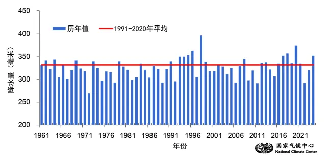 6月1日至8月31日,全国平均降水量历年变化(1961-2024年)