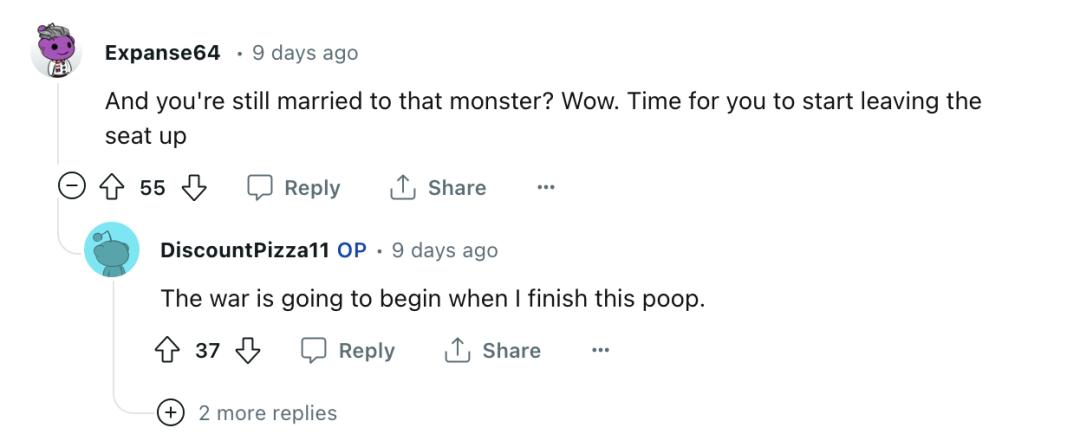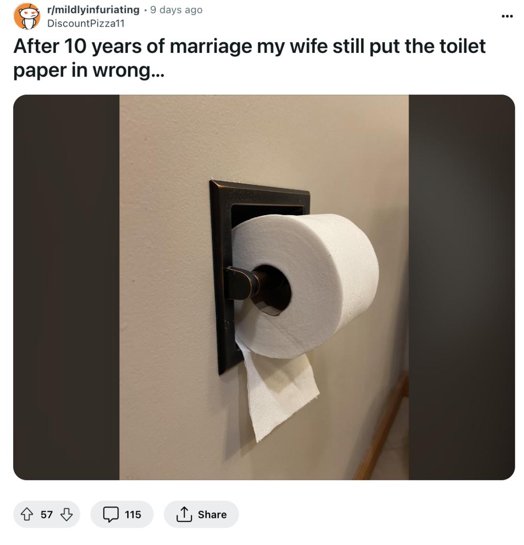 卫生纸的问题也可能导致家庭危机。Reddit的一位网友发帖称,结婚十年后,妻子还是放错了卫生纸。评论区不仅有大量网友劝分,还有人说“拉完这个泡泡就宣战”。