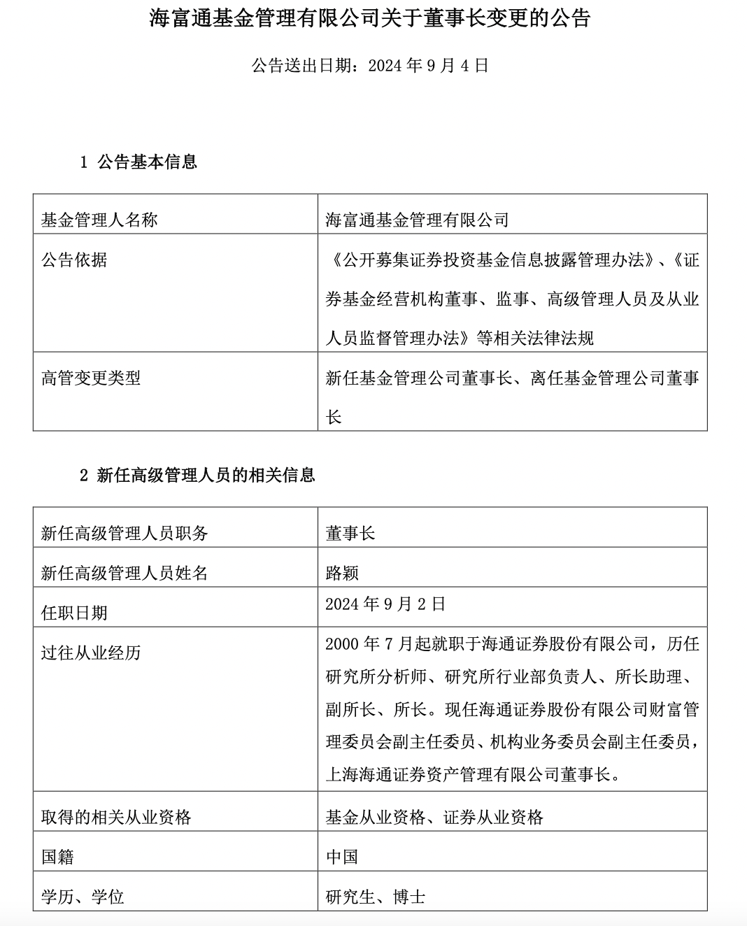 九月四日,海富通基金宣布,从九月二日起,原董事长杨仓兵到年退休,路颖接任董事长。