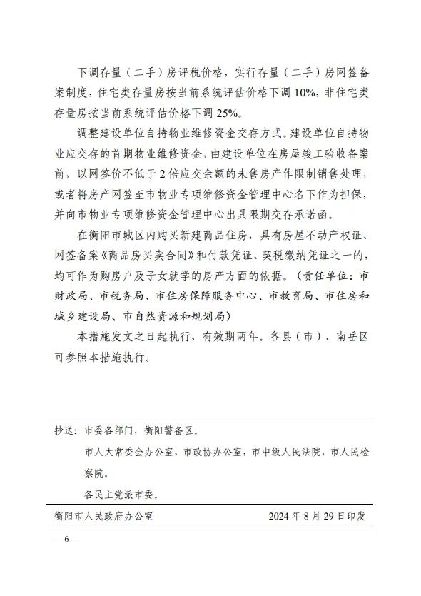近日,湖南省衡阳市人民政府办公室发布了《关于进一步促进房地产市场稳定健康发展的若干措施(试行)》。措施包括提高商品房计容和销售面积计算、提高住房公积金贷款额度、实施“房票”安置、激励商品房销售现房、支持房地产保险理赔、降低存量(二手)房评税价格等10项。该措施自发文之日起实施,有效期为两年。