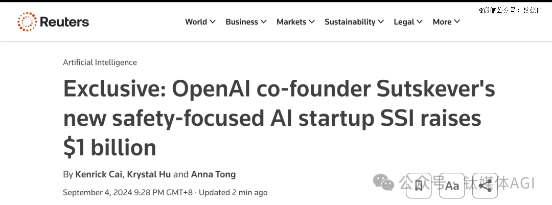 钛媒体App 9月4日消息,据路透社,由OpenAI联合创始人、前首席科学家、“ChatGPT之父”伊利亚·苏茨克韦尔(Ilya Sutskever)联合成立的新公司Safe Superintelligence (SSI) ,近期已完成10亿美元融资。