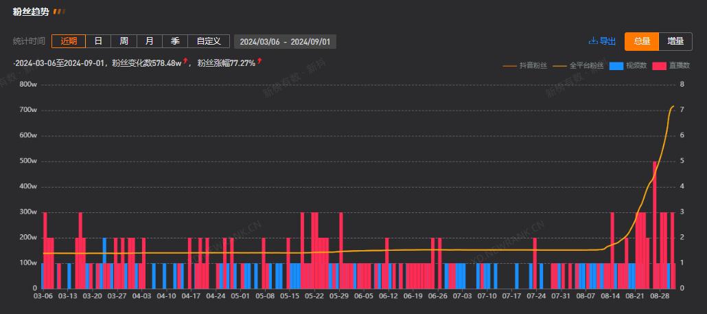 也是在这些粉丝的支持下,“k总”完成了奖励和带货,两头赚钱。根据新抖的数据分析,5月18日的第一场直播中,“k总”的直播销量不到1000件,但8月中旬走红后,“k总”的带货量持续上升,最高场均带货量超过100万。
