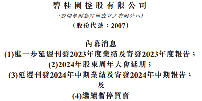 8月30日晚,碧桂园还发布公告,2023年全年年报将继续延期发布。受此影响,2024年中期年报不能按时发布,公司股票继续暂停交易。