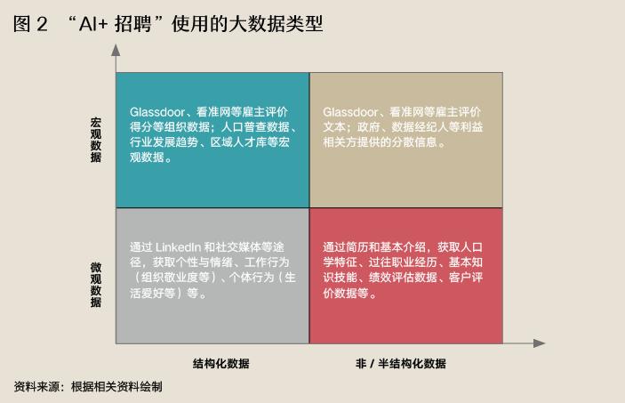 《2018年领英招聘趋势报告》指出,寻找和选择职位候选人是AI价值最高的环节。在人力资源大数据的前提下,实现人岗智能匹配。大数据的价值在于数据的真实性和多样性,而不是传统的简历数据和背调数据。从数据层面来看,人力资源大数据不仅包括人口特征、职业经验、个人行为等微观数据,还包括组织数据、行业趋势等外部宏观数据,如用人单位评价。从数据结构来看,不仅有分类清晰、可以直接操作和处理的结构化数据,如教育经验和过去的绩效评估,还有采访、行为跟踪、社交媒体轨迹等丰富的非结构化或半结构化数据(详细图2)。