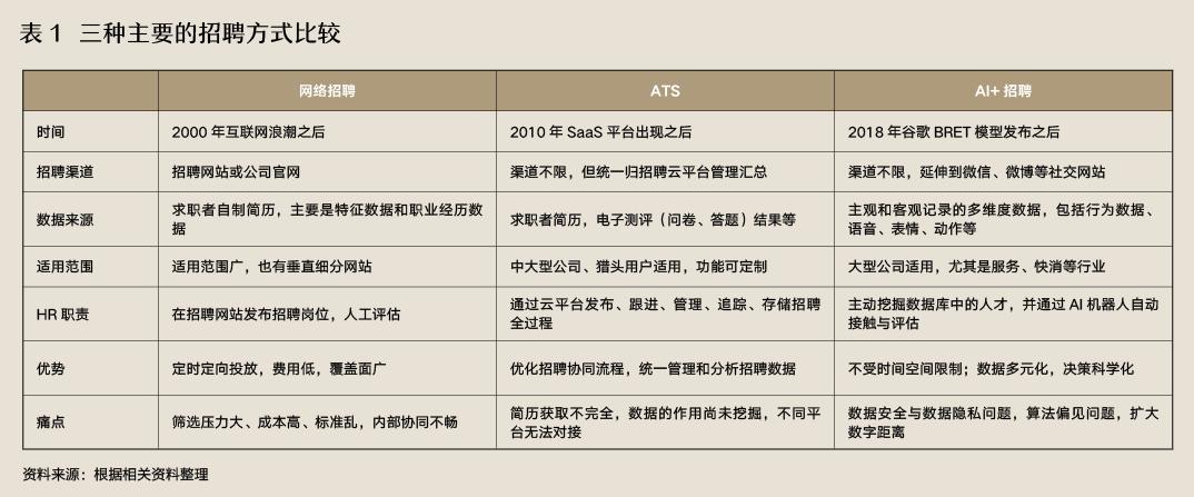 电子招聘(e-Recruiting)基于不同的渠道和技术手段,我们主要经历过网络招聘和招聘管理系统(Application Tracking System, ATS)、“AI 招聘三个阶段,每个阶段的特点和比较详细表1。