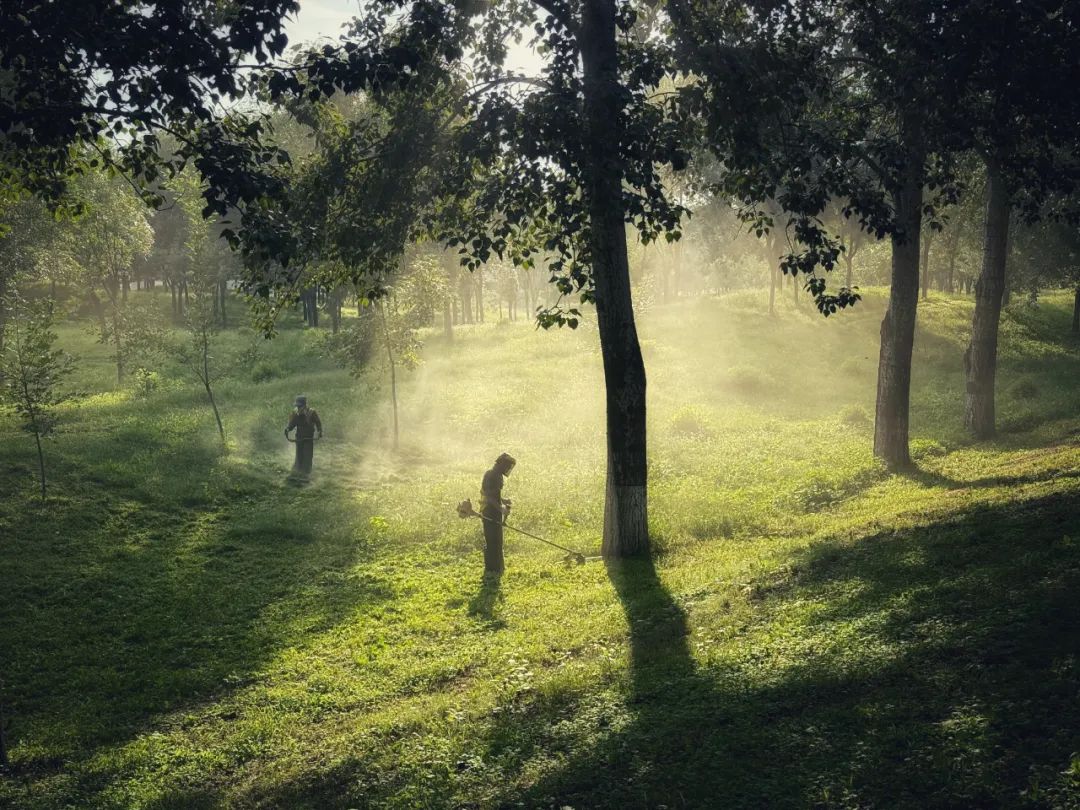 北京- 2024年8月28日,温榆河左堤路边整理草坪的工人。拾城 陈维松