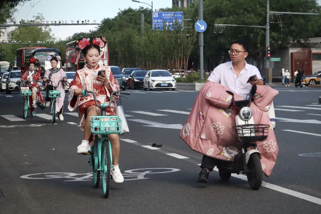 北京- 2024年8月22日,在地安门东大街上骑自行车共享和电动自行车的人。拾城。 陈维松