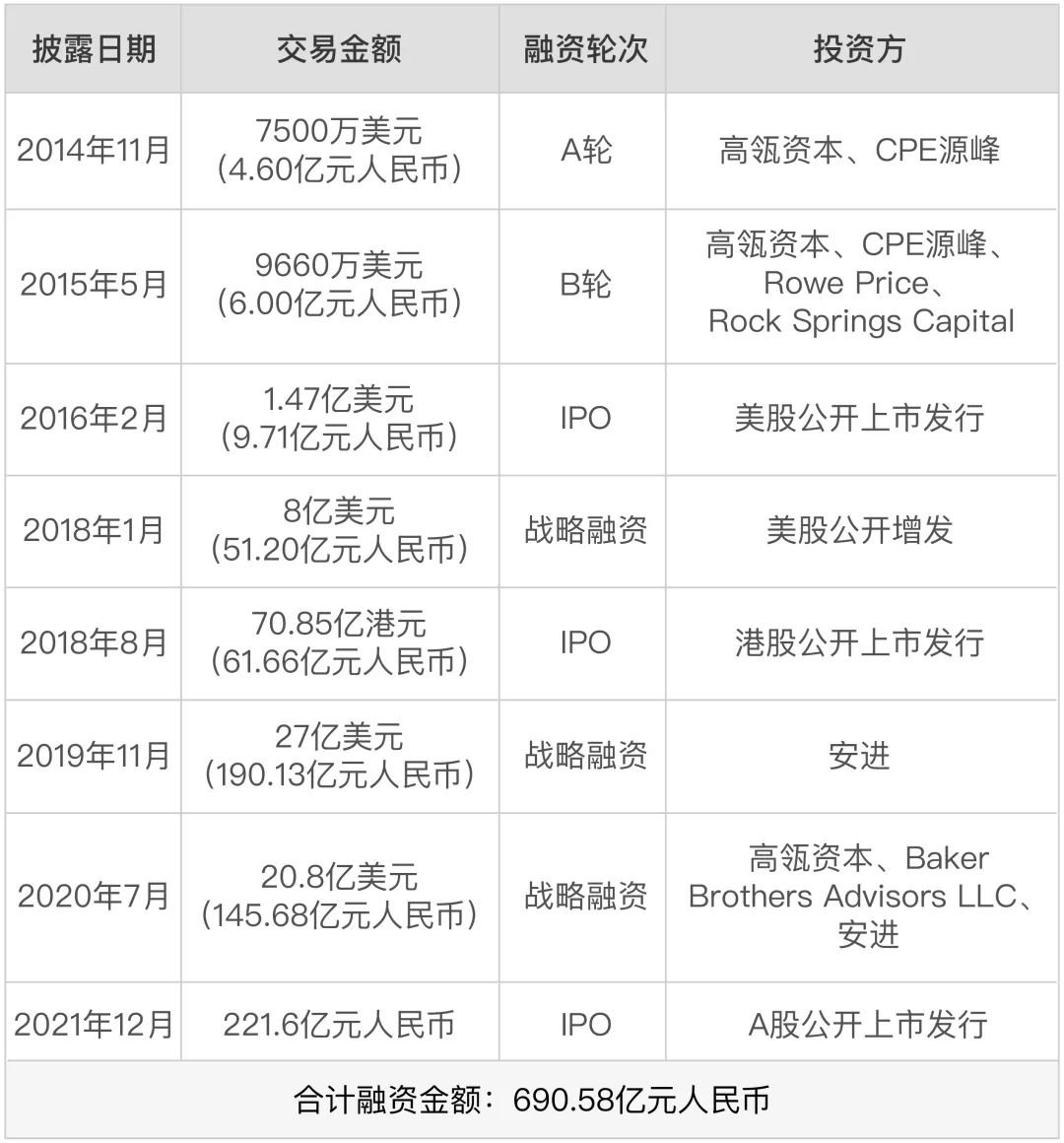 百济神州成立于2010年,先后在美股、港股、a股上市。根据天眼查公开的融资信息,源媒汇梳理了百济神州近年来的融资历程。自2014年首次获得高淳资本和CPE源峰7500万美元的A轮融资以来,百济神州前后共融资8次,总额约690.58亿元。