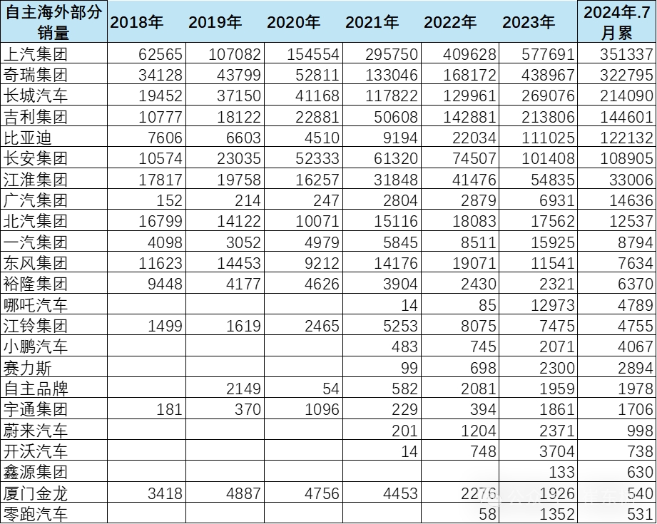 事实上,汽车出海仍然是燃油车的主导,而且越来越明显,这是头部企业的游戏。2018年,奇瑞的海外销量是江淮集团的两倍左右,到2024年,差距已接近10倍。