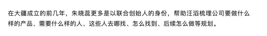 我不确定朱晓蕊在她之后孵化的企业中扮演了什么角色,以及当前的职位。朱晓蕊在接受《中国企业家》采访时,将自己描述为大疆创业导师的角色。但是正如前面亲身经历过大疆创业过程的前员工所说,现在流传的大疆创业故事中“含师量”有点重。据我所知,大疆创业的过程十分艰难,是一步一步摸索出来的,这个过程不能依赖于所谓的“教”和“导”。