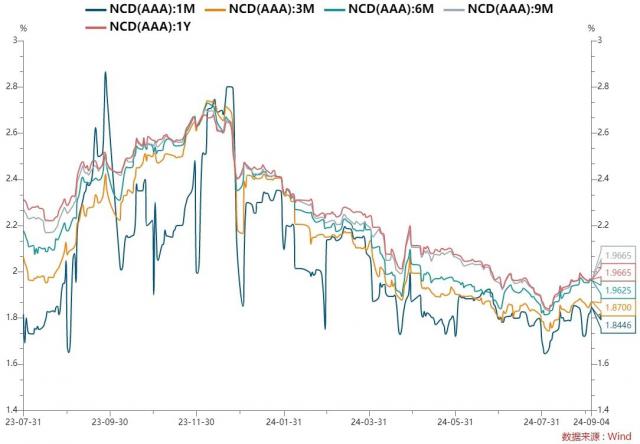 国有和主要股份制银行一年期同业存单二级最新交易在一年期 1.97% 上下。