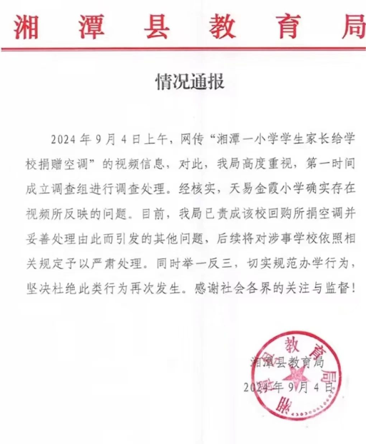 9月5日,据湖南省湘潭县媒体中心官方抖音号“中国莲乡”报道,湘潭县教育局发布此事报告,称相关情况属实,已责成学校回购捐款空调。
