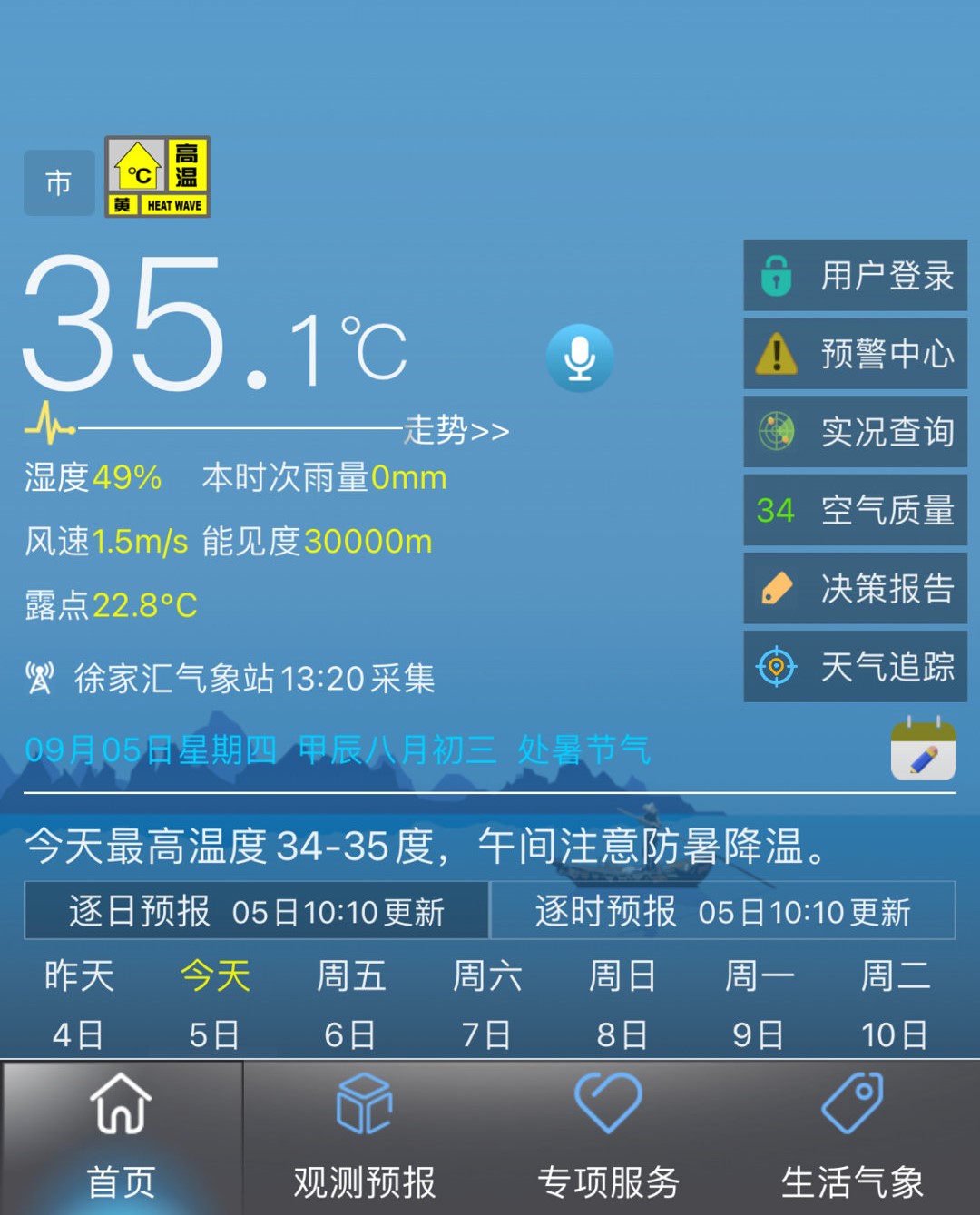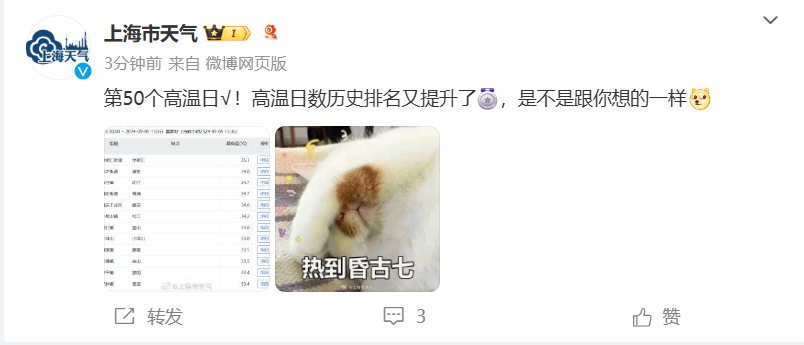 上海徐家汇站9月5日13时20分气温达到35.1℃。这是今年上海第50个高温日。@上海市天气图