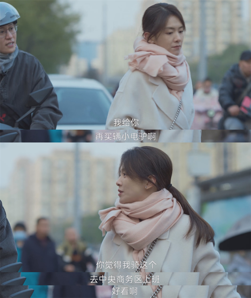 在沈磊建议给谢美蓝买一辆电动车的时候,谢美蓝并不愿意,觉得骑电动车去中央商务区上班不好看。