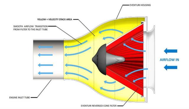 Eventuri 这是一种新型的进气设计,已经获得专利。 -- 倒置锥形过滤器,并与进气口分离。过滤器不再决定气流形态,而是通过去除过滤器与进气口之间的直接连接。