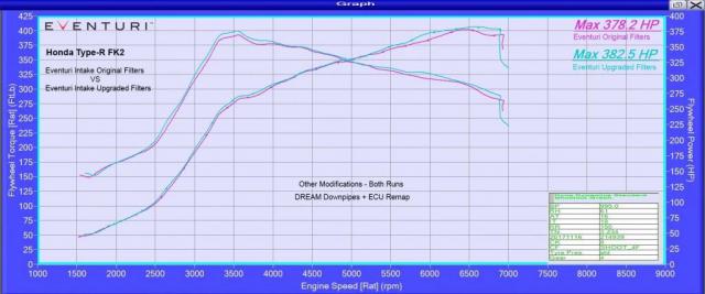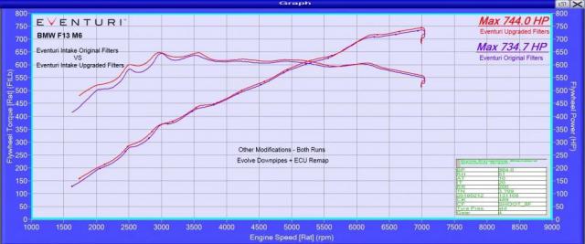 通过 Dyno 检测 Eventuri 与原装过滤器和升级过滤器相比,进气口的功率和扭矩都有所上升。这个验证 Eventuri 理论模型,证明升级后的过滤器确实对进气口的气流有显著影响。
