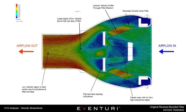 下图是 CFD 模拟,显示 EVENTURI 进气系统中的速率流线 -- 包含新过滤器与原过滤器的对比。