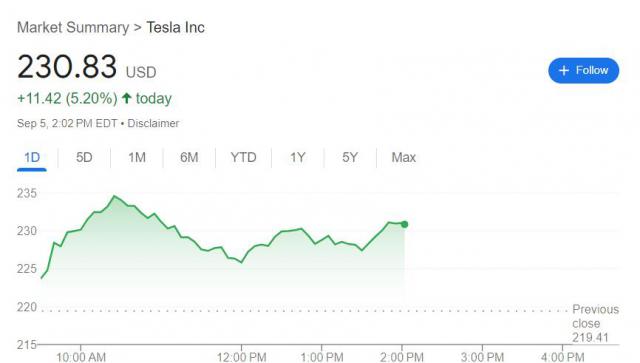 美东时间 9 月 5 周四,特斯拉股价加速上涨,开盘价上涨至约。 235 美金,刷新 7 月 23 到目前为止,盘中高位,日内涨幅达到 7.1%,之后涨幅收窄,午盘曾涨幅收窄。 4% 上下,或者连续两天收涨超过收涨。 4%,并收创 7 月 29 到目前为止,新高将在周三和周四两天累计反弹。 9%。