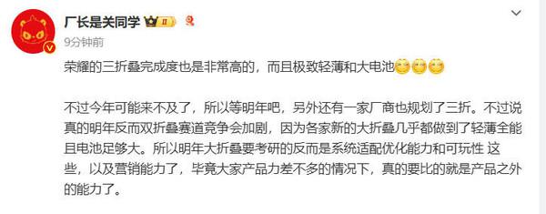 根据爆料人士“厂长是关同学”透露,荣耀的三折叠屏完成度很高,内置大容量电池,选用轻薄设计。然而,荣耀三折叠手机今年发布已经来不及了,明年出现的可能性很大。除荣誉外,还有一家厂商还计划了三部折叠手机,可能是小米或小米。 OPPO,但根据 CNMO 据了解,这两家厂商只是计划,似乎明年并没有推出三折叠屏的想法,而是选择了观望。