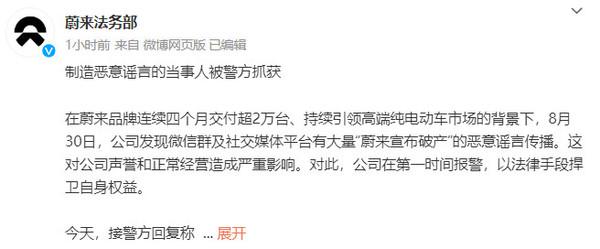 蔚来:谣言破产者已被抓获 下一步,深入挖掘背后的组织者