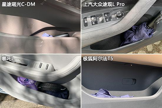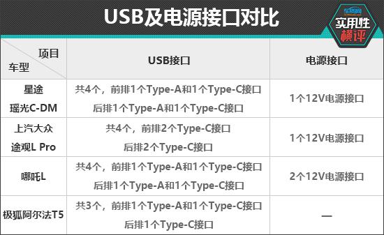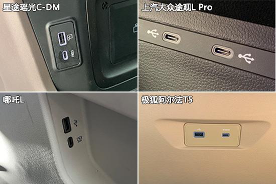 在充电插座方面,四款车在前面 / 后排均配有 USB 接口,基本能满足日常使用的需要。上汽大众途观是其中之一 L Pro 整个车辆都配备了 Type-C 一种规格接口,适应性差。相比之下,还是星途瑶光。 C-DM 和哪吒 L 表现最好,前面 / 后排各自提供 Type-A 和 Type-C 接口,选择自由度较高。除极狐阿尔法外 另外,三款车型至少都配备了T5。 1 个 12V 电源接口,实用性能令人满意。