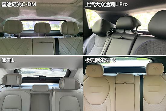 在车内舒适性方面,四款车后排都配备了三个头枕,两侧头枕都支持高低调整。相比之下,哪吒 L 还有极狐阿尔法 T5 后排中间头枕尺寸小,与两侧头枕明显不同。不同的是前者支持高低调整,后者不仅无法调整,而且位置太低,枕头舒适度差。