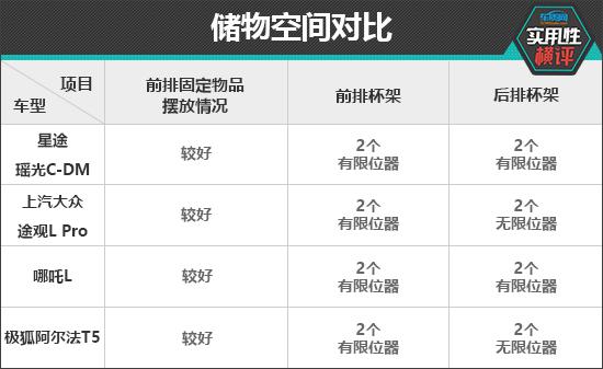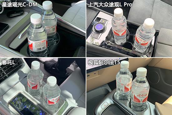 另外,在杯架检测中,四辆车在前面。 / 后排各有配备 2 一个杯子可以满足日常使用的需要。然而,上汽大众途观 L Pro 还有极狐阿尔法 T5 后杯架没有配备限位器,所以放置水瓶会显得不合适。