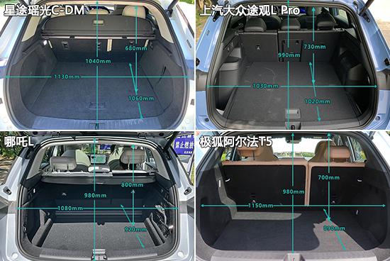 在后备箱空间方面,虽然四款车或多或少都有一些数据没有达到同级别车型的平均检测值,但最好的性能是星途瑶光 C-DM,只有一个后备箱高度的测试结果有点拖后腿。相比之下,上汽大众途观 L Pro 和哪吒 L 主要问题是后备箱张口总宽度表现不佳,与同级别车型检测平均值存在一定差距。