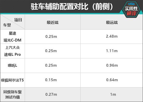 在后方驻车雷达测试中,四款车的最远检测距离都超过了同级别车型的平均检测距离,性能显著。在最近的提醒距离方面,星途瑶光 C-DM 和上汽大众途观 L Pro 均是 0.25m,与测试经验一致。