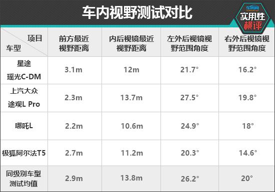 除星途瑶光光外,在前视野检测中 C-DM 此外,其它三款车型的测试结果均达到同级别车型的测试平均水平。在这些车型中,哪吒 L 表现最佳,前方近期视线距离只有 2.2m。另外,在后视线检测中,还是哪吒? L 最好的结果。相比之下,上汽大众途观只有四款车。 L Pro 后视线分数未达到同级别车型检测平均水平。