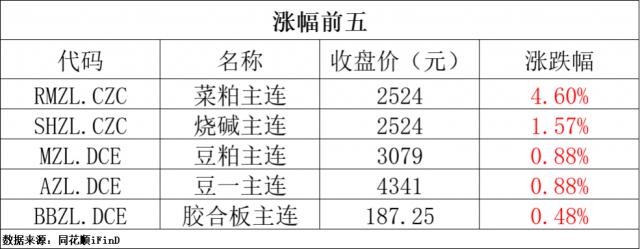 菜粕涨超 烧碱增加4%以上 1%,豆粕,豆一,胶合板小幅上涨。