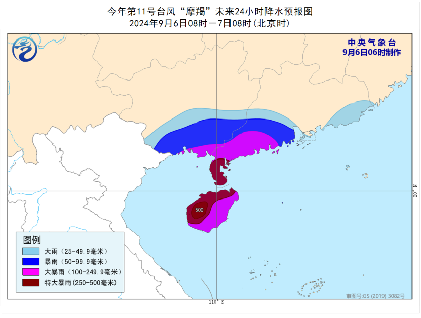 降水预报:9月6日08:08:00至7日08:00,广西东南部、广东西南部、海南岛暴雨,部分地区暴雨,广东西南沿海地区、海南岛中西部地区和北部地区暴雨(2500~500mm)。