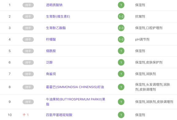 根据美丽实践的大数据,与2023年下半年(7-12月)相比,2024年上半年(1-6月)市场上热门化妆品成分名单的变化并不明显,前9名中含有透明质酸钠和维生素E。、烟酰胺、泛醇等原料的受欢迎程度持续下去,依克多因、波色因、积雪草等传统热门成分的受欢迎程度不断提高。