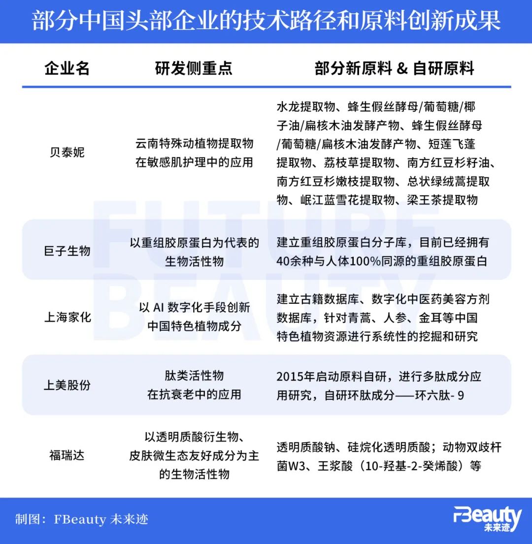 《FBeauty的未来迹象》发现,贝泰妮、巨人生物、上海家化、上美股份、福瑞达等公司已经逐渐探索出一条具有不同市场定位、能够形成性能优势和更高认可度的原材料研发路径,逐步掌握各自领域的技术话语权。