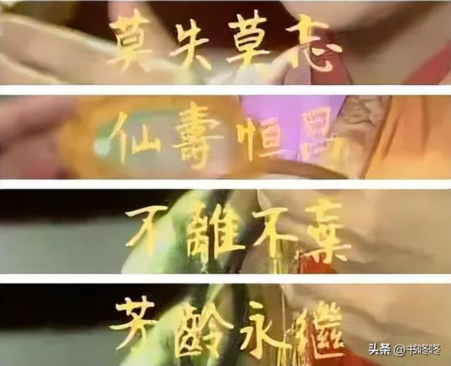 金玉良缘,宝玉和宝钗的配饰分别是八个字,正是:莫失莫忘,仙寿恒昌;不离不弃,芳龄永存。。