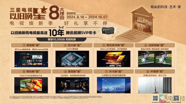 以旧换星活动是三星电子回馈用户、促进家庭消费向更环保、更智能发展的重要举措。活动时间是活动时间的重要举措。 8 月 18 日至 10 月 7 日本,只需在三星线上商店或线下商店购买指定型号的电视机即可参与活动。