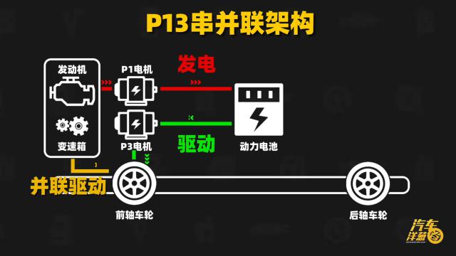 先来说一下当前市场上主流的插混系统,多为 P13 以省油为主要目标的串并联架构。在大多数情况下,发动机是不驱动的,主要工作是串联。 P1 电动机发电。驱动工作由此进行。 P3 电机完成。