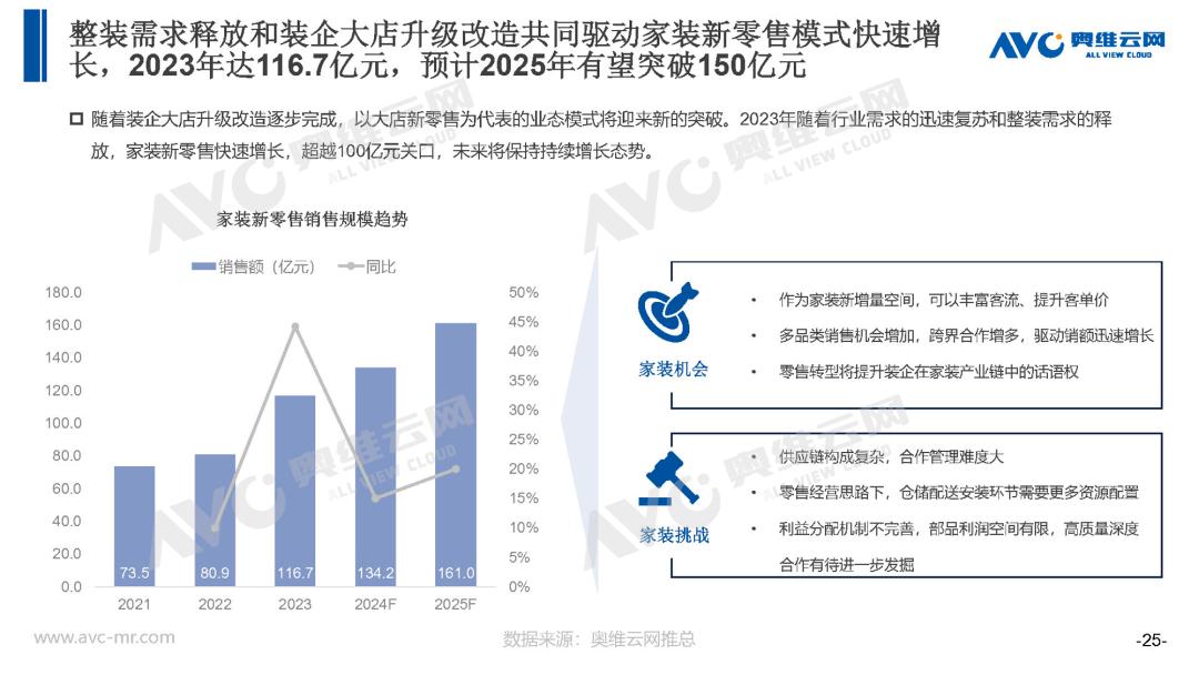 根据家居新模式的梳理,2023年家装市场规模达到4.2万亿元。虽然目前已经进入股市,但在新旧置换、新旧房屋安装等需求和政策的刺激下,装修行业仍有望向全屋安装和装修企业的大店升级,带动新的家装零售模式快速增长。预计2025年将超过150亿元。