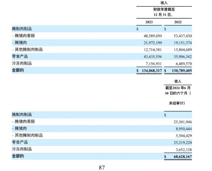 根据最新的招股书,截至2024年6月30日,2022年,2023年,腌制肉制品的利润分别为8839.3万美元、8327.6万美元和3975.2万美元;每期总收入分别为67.17%、61.94%和57.92%;报告期内零食产品的利润分别为3590.6万美元、4363.6万美元和2521.9万美元;分别占27.48%、32.83%和36.75%。