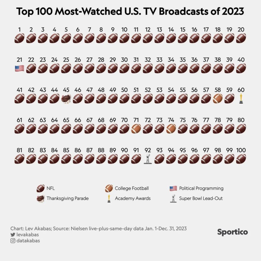 NFL赛事平均收视率在2023年常规赛期间达到1800万,这是自2015年以来的最高纪录,也是历史第二高纪录。NFL在2023年美国收视率最高的100个电视节目中占有93个,市场渗透率令人惊叹。