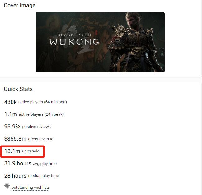 根据市场调查机构VG 根据Insights的统计,《黑神话:悟空》在Steam平台上销售了超过1800万件,销售额约为8.67亿美元。国外媒体Gamalytic显示,同一平台销售额约为1480万件,销售额约为8亿美元。所以结合2组数据保守估计,仅在Steam平台上,至少有1500万件“黑神话”的销量。