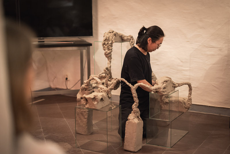 瑞典艺术家RomanGens在声音和艺术表演阶段 而且MariaNordsoLundberg带来了充满瑞典的瑞典⻛格的空灵之声,他们的表演仿佛把观众带入了一片宁静而深远的北欧森林,那里充满了自然的和谐与宁静。她们的声音表演,就像天籁之声,纯洁而深邃,给人以精神享受和精神清洁。而且旅瑞雕塑艺术家张时⻜即兴造型艺术创作,与声音表演相辅相成。