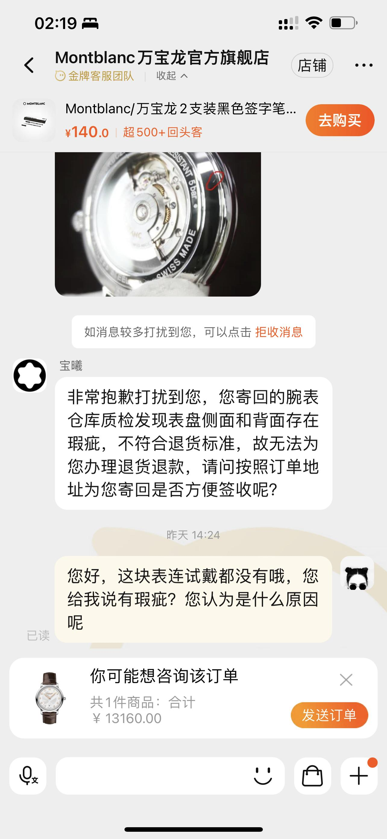 据孙女士介绍,8月14日,“Montblanc万宝龙官方旗舰店”客服联系她表示,表盘侧面和背面存在缺陷,不符合退货标准。孙女士很困惑,“手表没有试穿”,“手表的塑料薄膜自始至终都没有打开,为什么会造成缺陷?”