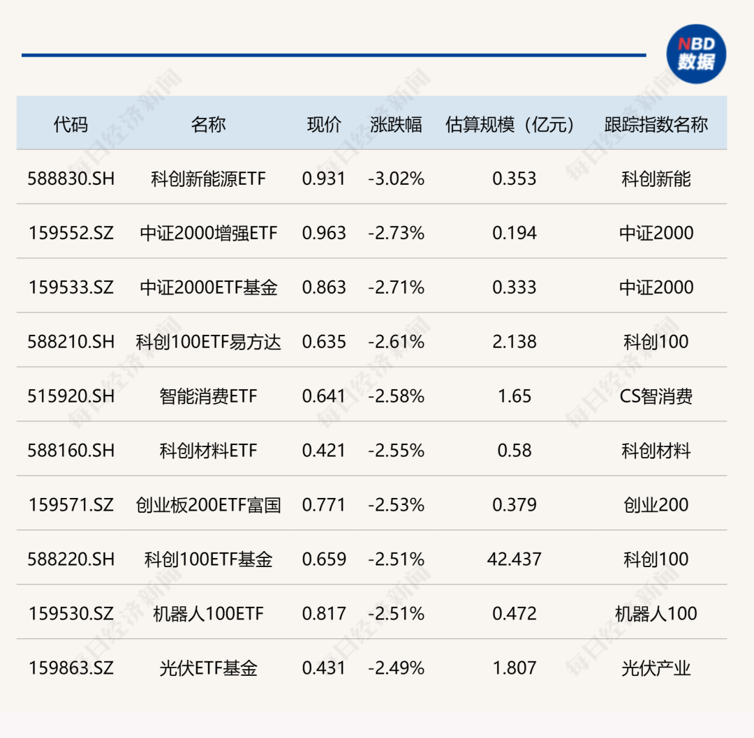 下跌方面,科创新能源ETF下跌超过3%,多只中证2000。、ETF跌幅超过2%,如科创100。