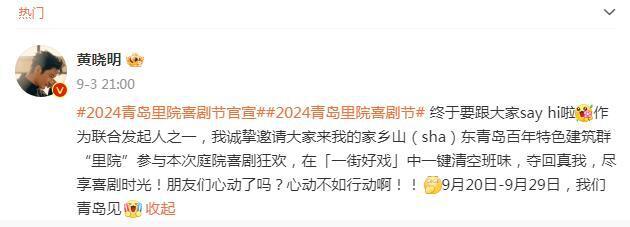 9 月 3 那天,艺人黄晓明在社交平台上发了一条信息:“ 2024 青岛里院喜剧节官宣,终于要跟大家说了 say hi 啦。作为联合发起人之一,我真诚邀请大家来我的家乡。山东青岛百年特色建筑群里院参加了这次庭院喜剧嘉年华,一键清空了街头剧中的班级气息,抢回了真实的自己,享受了喜剧时光!朋友们兴奋吗?与其行动,不如行动!"
