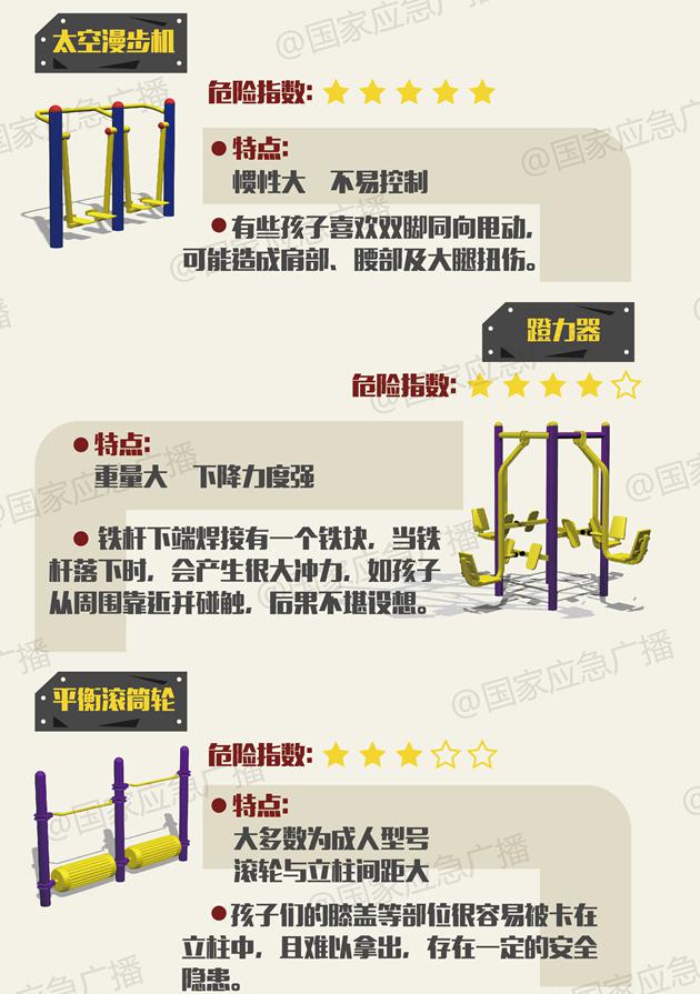 现在,许多社区和公园的公共健身器材都很完善,成为居民休闲的好地方。但是,在使用健身器材时,一定要注意规范操作,尤其是父母要注意,切忌让孩子把它当作“玩具”,以免发生意外。