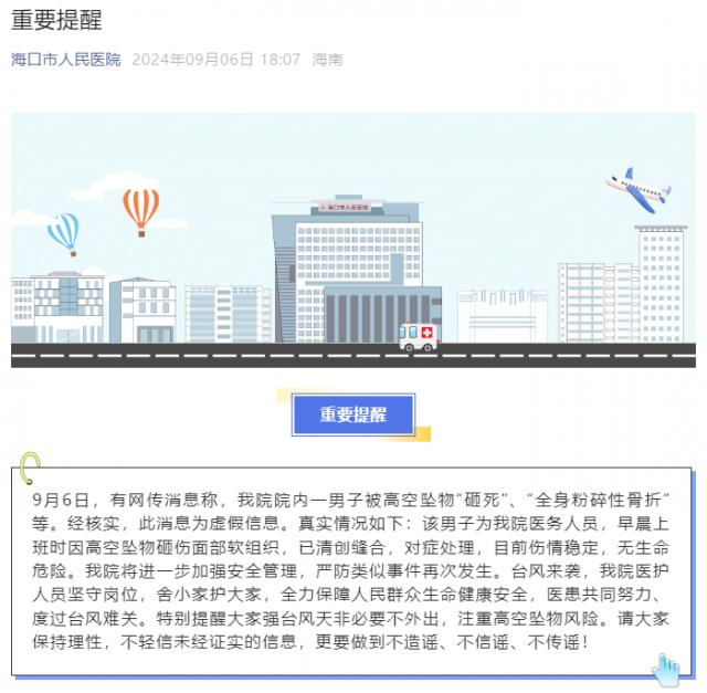 9 月 6 海南海口市人民医院日报,9 月 6 日,有网爆报道称,我院一名男子被高空抛物“砸死”、“全身粉碎性骨折”等。经过核实,这个消息是虚假信息。真实情况如下:这个人是我们医院的医护人员。他早上工作的时候,因为高空抛物撞到了面部的软组织,已经清创缝合,对症治疗。目前伤势稳定,无生命危险。