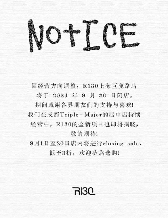 关店前还有一个活动值得注意。日前,日播集团旗下策展买家店 R130 宣布巨鹿路店即将到来 9 月底关门,现在已经进入。 closing sale 的时期,R130 一直都有很好的品味,店里带来了很多设计师品牌,而且选款也很讲究,关店还是很遗憾的。