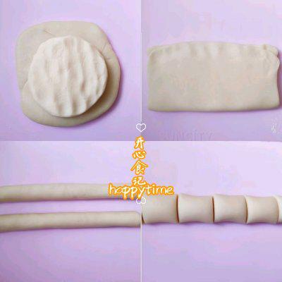 5、采用大包饼技术,油皮包裹油酥成长方形,一次三折继续擀成长方形,卷起后分成长方形。 2 每一条条,均分 8 份,一共 16 个