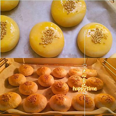 6、将馅料卷开,收边捏平,表面刷蛋黄液,撒上芝麻,烤箱提前预热,上火, 170 度,去火 180 度,烤 30 分钟,表面金黄及时盖锡纸,避免着色过重。